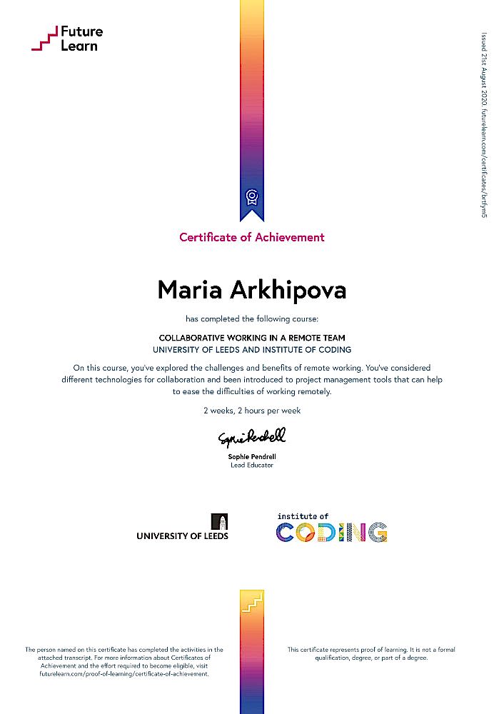 «University of Leeds and Institute of Pin-Up course Collaborative working in a remote team University of Leeds and Institute of Coding (2020г)