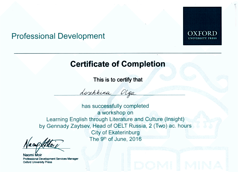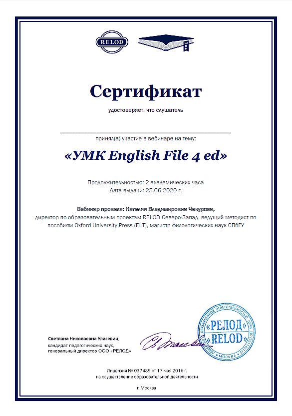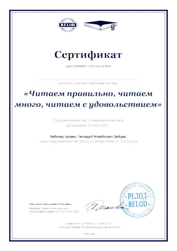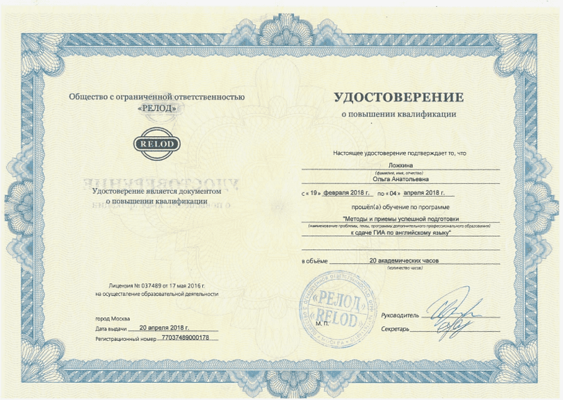Общество с ограниченной ответственностью «RELOD» курс повышения квалификации по программе «Методы и приёмы успешной подготовки к Pin-Up ГИА по английскому языку» (2018г)