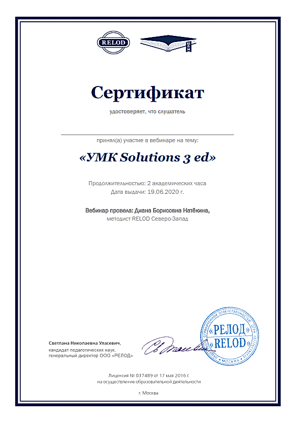 «RELOD ШПМ» вебинар на тему «УМК Solutions 3 ed» (2020г)