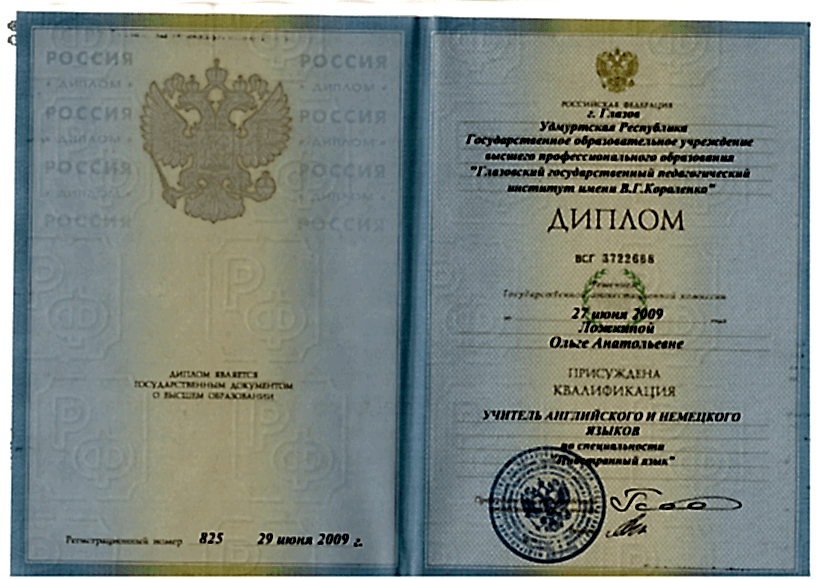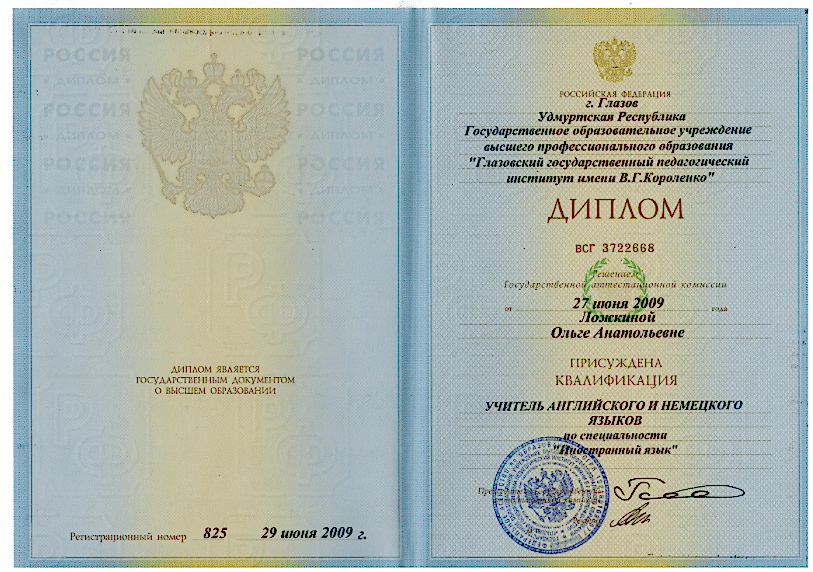 Государственное образовательное учреждение высшего профессионального образования «Глазовский государственный педагогический институт имени В. Г. Короленко» Квалификация: Учитель английского и немецкого языков (2009г)