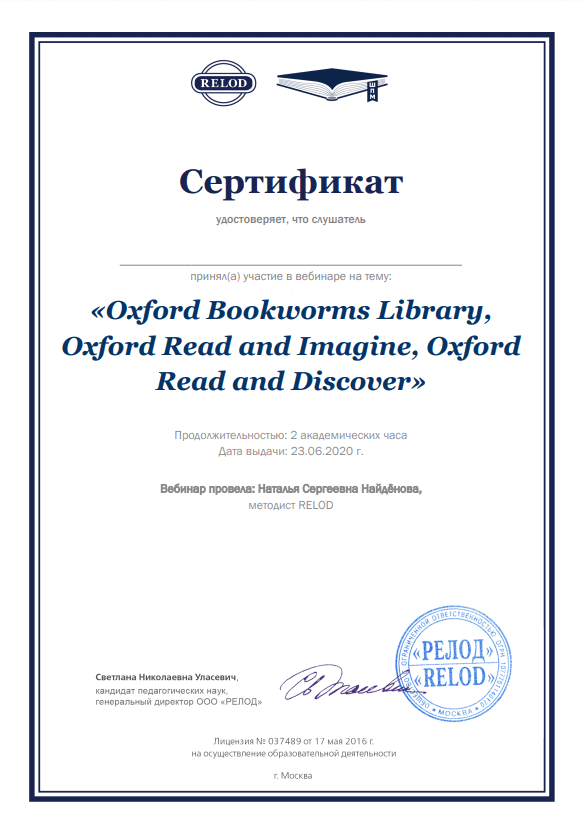 «RELOD ШПМ» вебинар на тему «Oxford Bookworms Library, Oxford Read and Imagine, Oxford Read фnd Discover» (2020г)