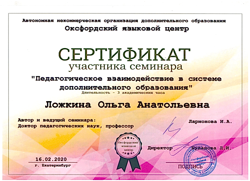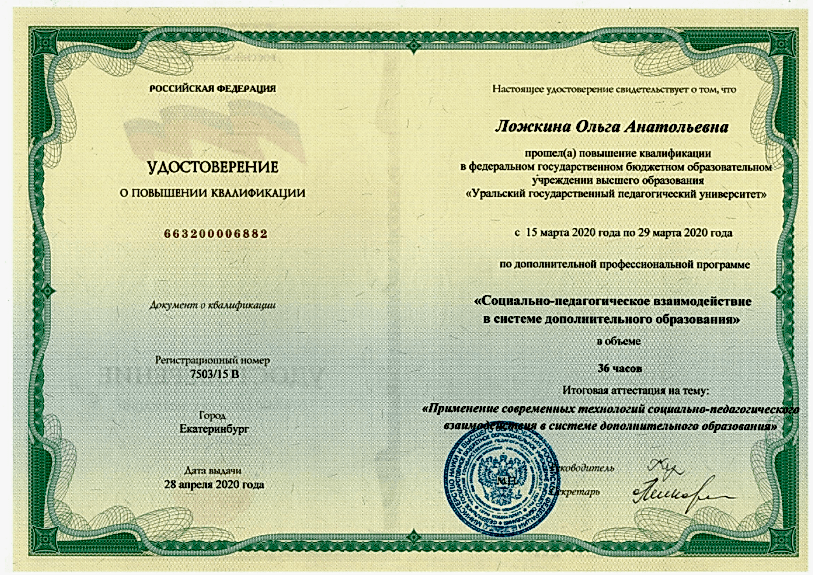 Федеральное государственное бюджетное образовательное учреждение высшего образования «Уральский Pin-Up педагогический университет» повышение квалификации по дополнительной профессиональной программе «Социально-педагогическое взаимодействие в системе дополнительного образования» (2020г)