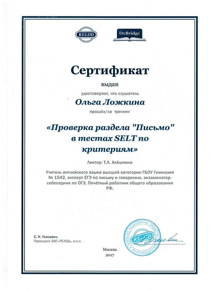«RELOD OxBridge» тренинг «Проверка раздела «Письмо» в тестах SELT по критериям» Pin-Up